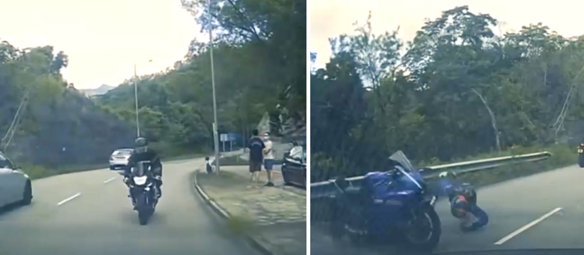 According to dashcam footage from a private car and a motorcycle group, a large motorbike was stopped on the road at around 10am, its rider chatting with some pedestrians. A private car travelling along the road approached the stopped motorcycle and drew to a rapid stop. Moments later, Mr Tam, 29, smashed his motorcycle into the back of the car, flipped over and struck another motorcyclist coming in the opposite direction.